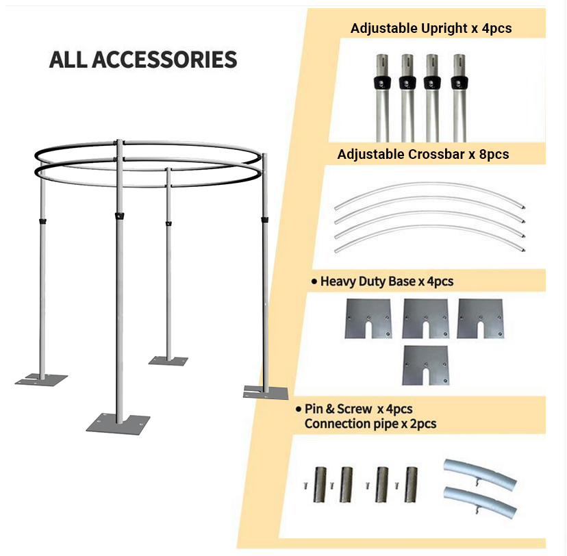 – This kit comes with 4 base units, 4 adjustable upright poles, and 2 round cross bar.